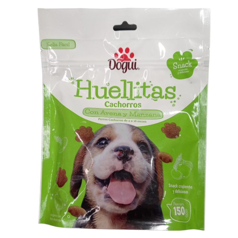 Dogui Huellitas sabor avena y manzana son pequeños bocaditos creados para potenciar el crecimiento y actividad de tu cachorro.